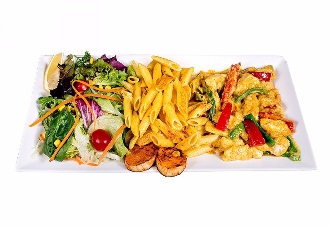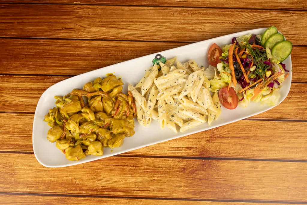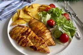 Izgara piliç göğsü, kremalı mantar sosuyla buluşuyor; yanında çıtır patates ve taze salata ile servis ediliyor...